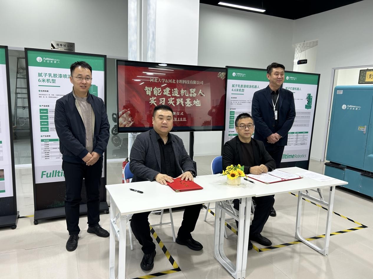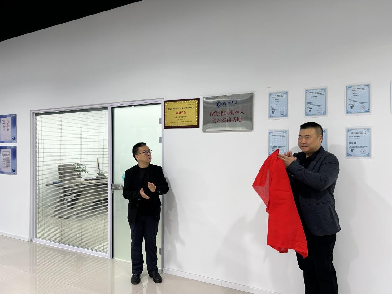 2025年10月21日,河北大学建筑工程学院与河北丰坦科技有限公司共建的“智能建造机器人实习实践基地”挂牌仪式在燕华城河北丰坦机器人4S展厅顺利举行。河北大学建筑工程学院院长杨三强、党委副书记佘丹丹、副院长杨少冲,保定市智能建造产业技术创新战略联盟秘书长刘玉建,河北丰坦科技有限公司董事长寇建伟,以及学院智能建造专业教师与学生代表共同出席仪式。